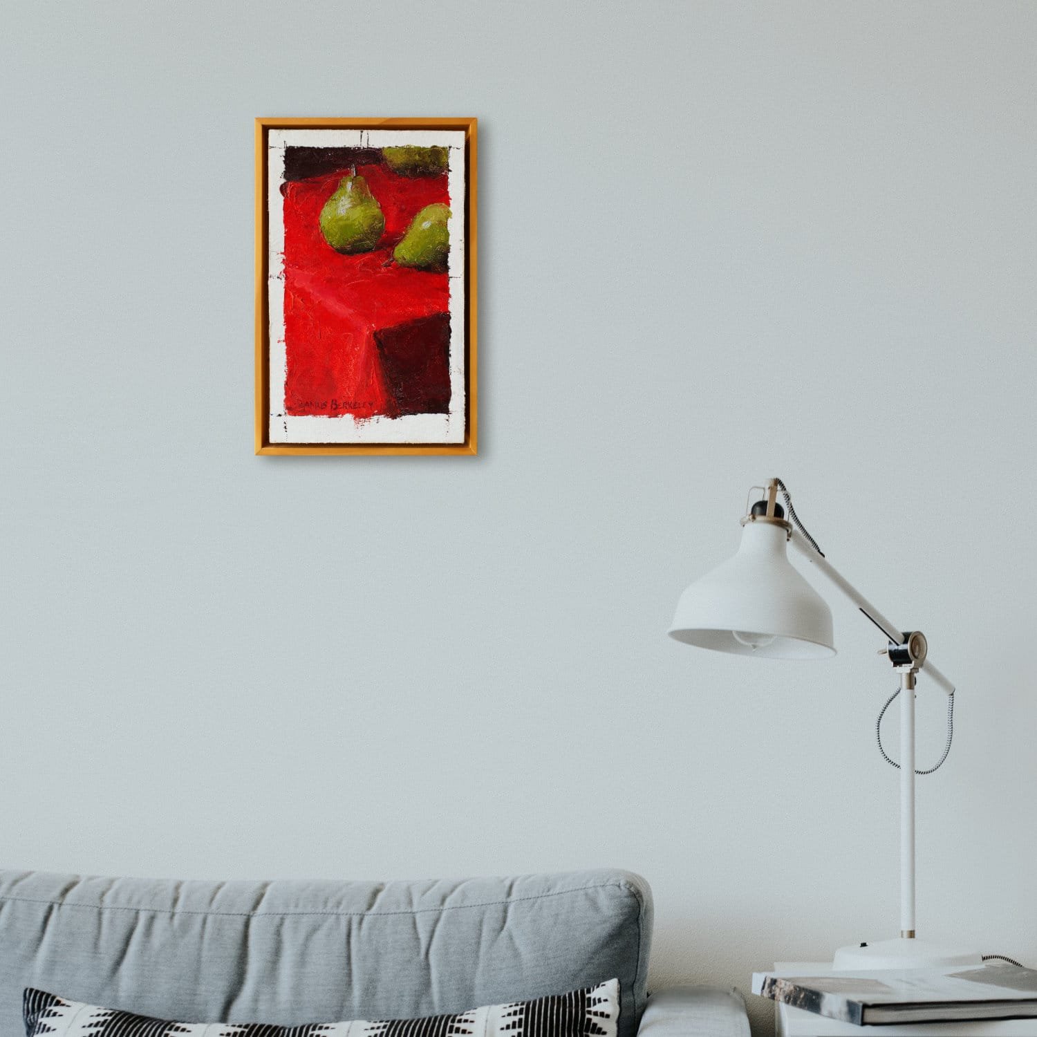 Oil painting of three green pears arranged on a bright red table cloth on a wall setting.