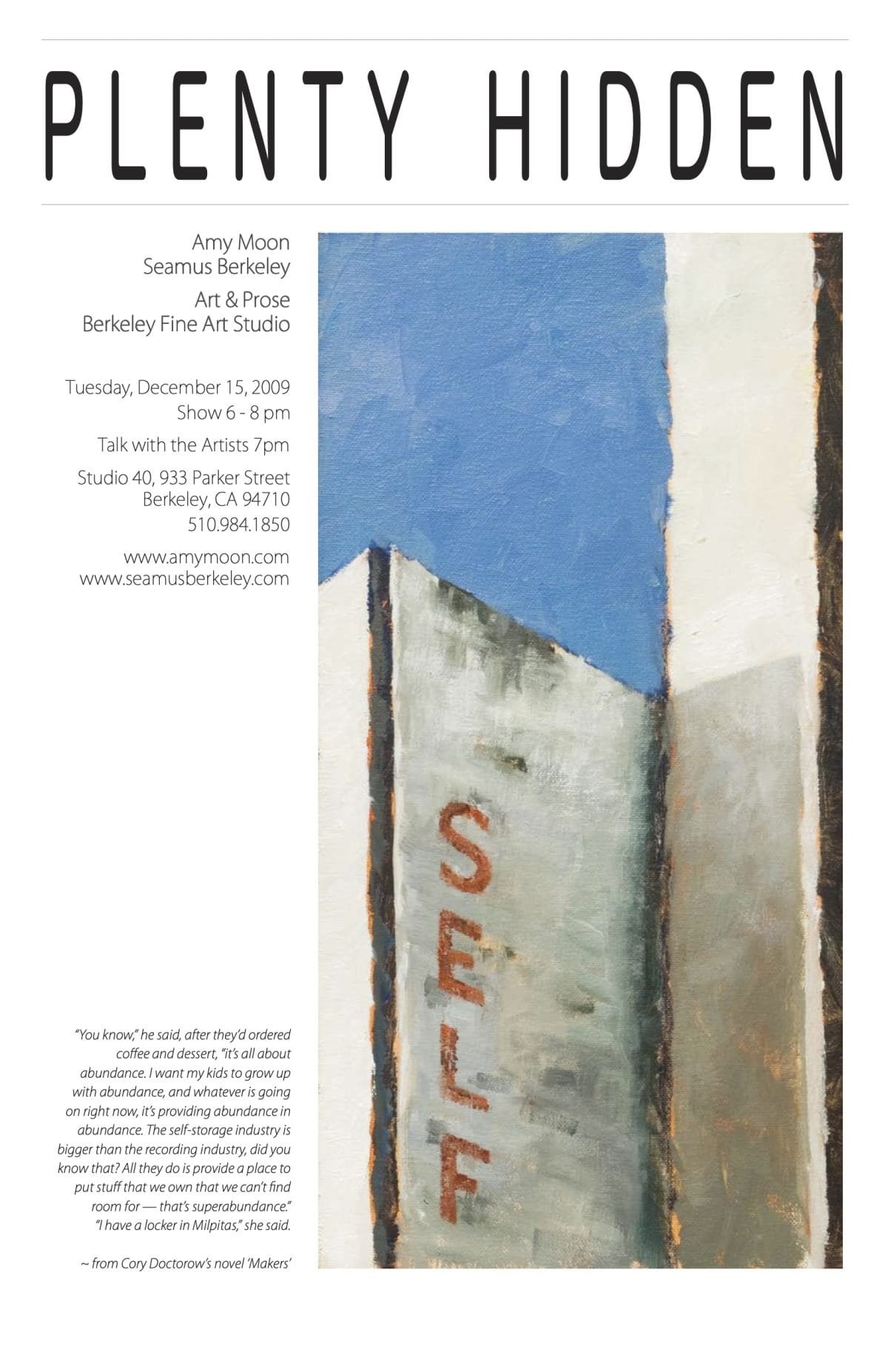 In another collaborative show between writer Amy Moon and painter Seamus Berkeley, the artists individually explore hidden aspects of a phenomenon: self-storage. When something — like self-storage — becomes a ubiquitous part of our lives and our landscapes, we often don’t see it. By taking a closer look, the artists explore what our relationship to our things says about us and how that affects our environment.