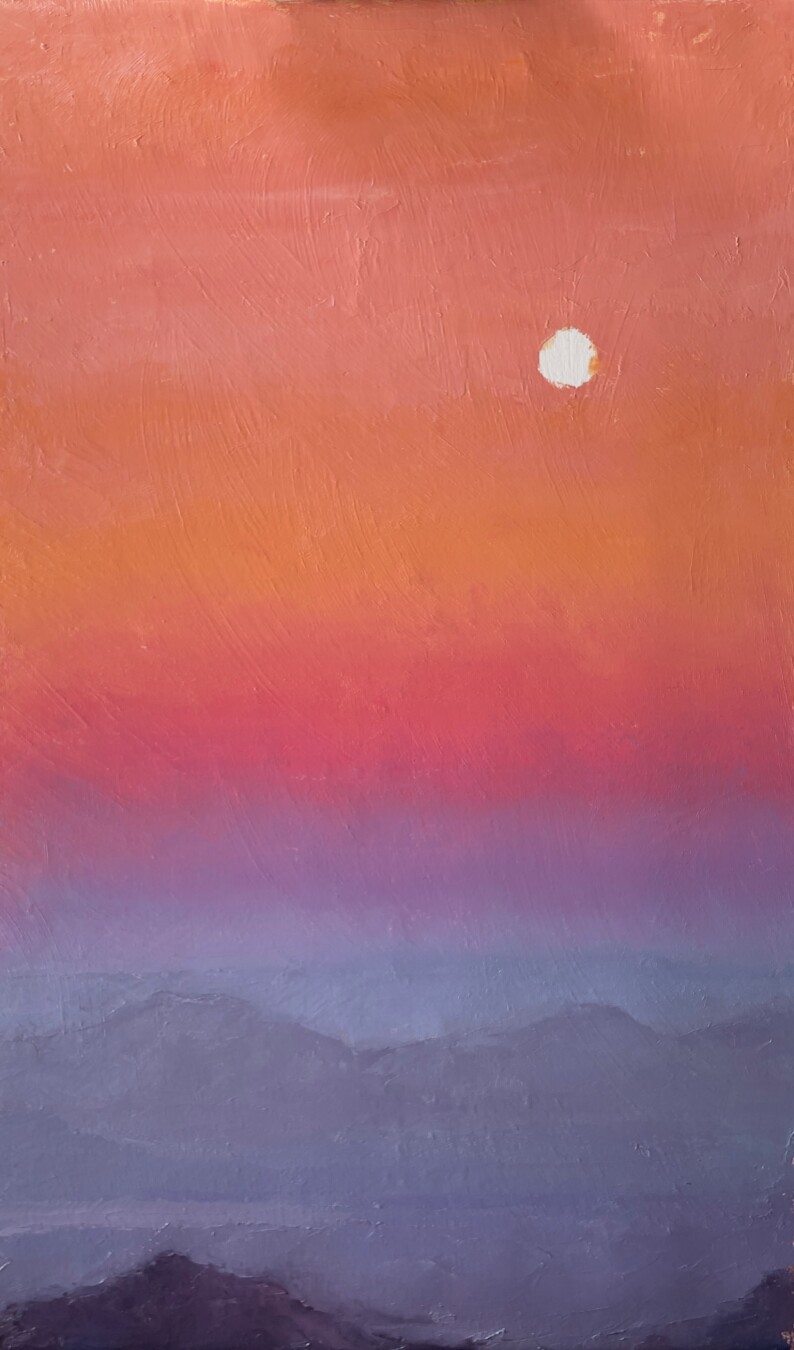 Sky Island Full Moon, Painting Seamus Berkeley Oil on canvas, 24″ x 14.25″ With profoundly evocative and seamlessly blended pastel colors, Seamus Berkeley transports the viewer to the otherworldly Sky Islands of the American Southwest. Standing on a subalpine plateau towering thousands of feet above the harsh desert, Seamus was awe-struck by the sun-lit glow of the full moon in the twilight sky. Sky Island Full Moon reflects Berkeley’s experience immersed in this archipelago in the clouds. #moon #southwest #sky #painting Available for purchase: https://seamusberkeley.com/shop-for-art/sky-island-full-moon/